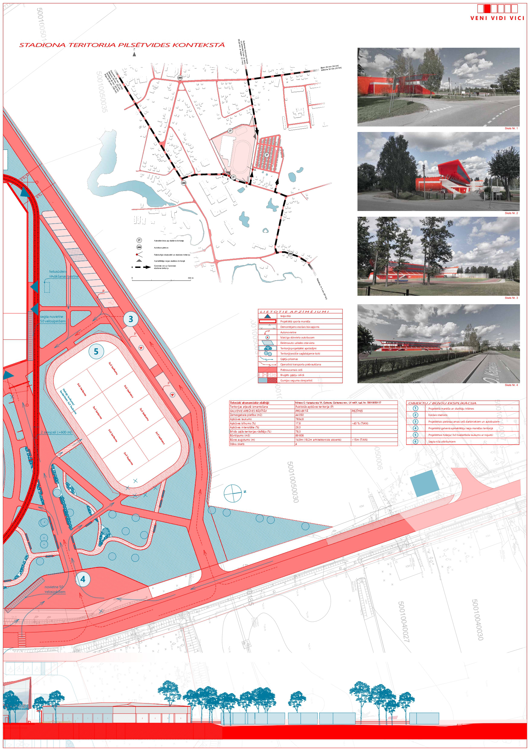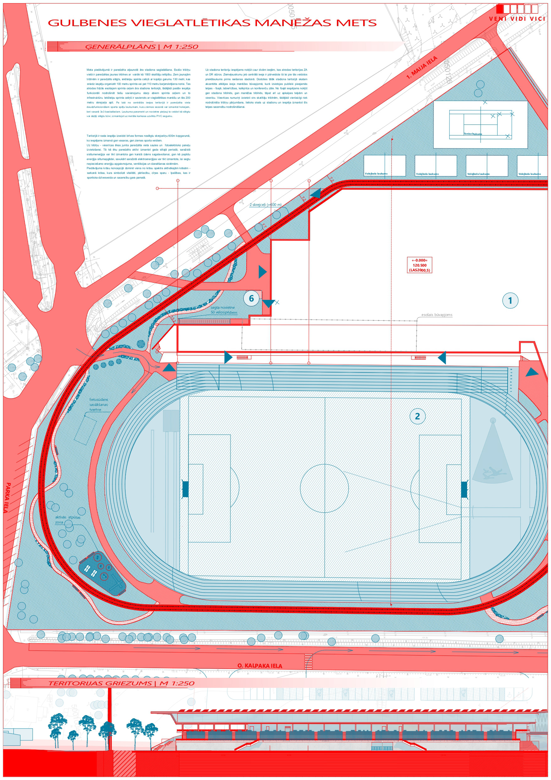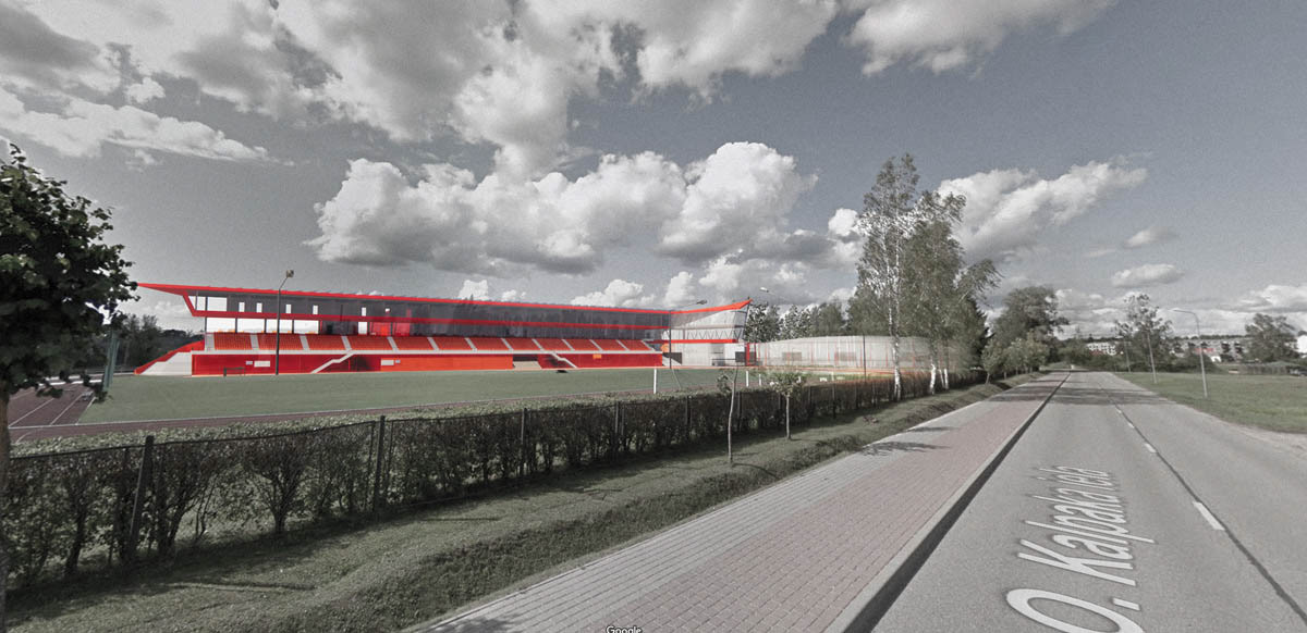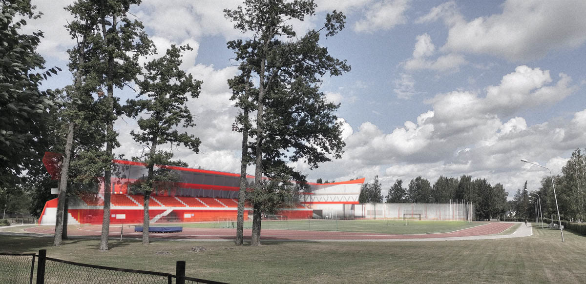 During the design phase, a study of the stadium's location within the context of Gulbene city was conducted. This study determined the main access roads and the appropriate placement of the main entrance nodes, parking, and access points for emergency vehicles. The project's color concept is dominated by red, one of the most active colors in the spectrum, associated with vitality, confidence, and fighting spirit. The project proposal won second place in the competition.