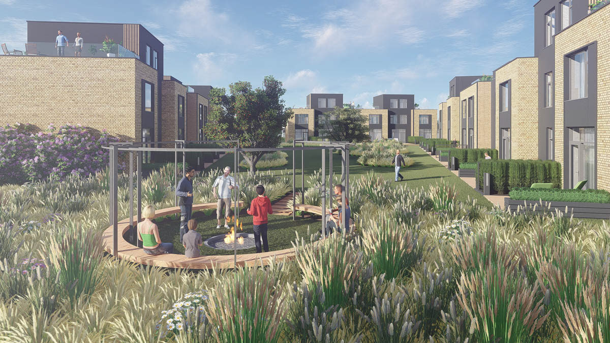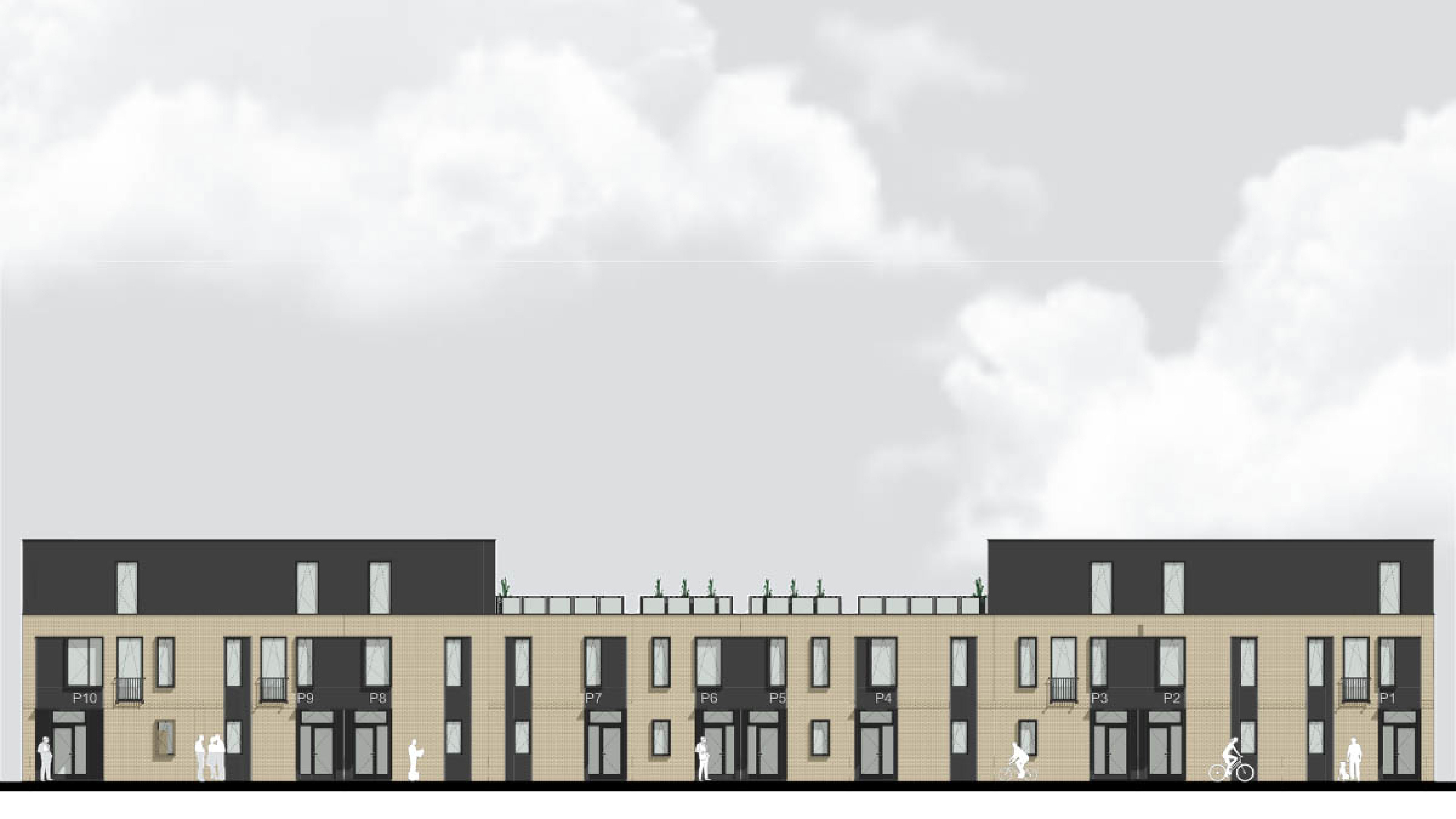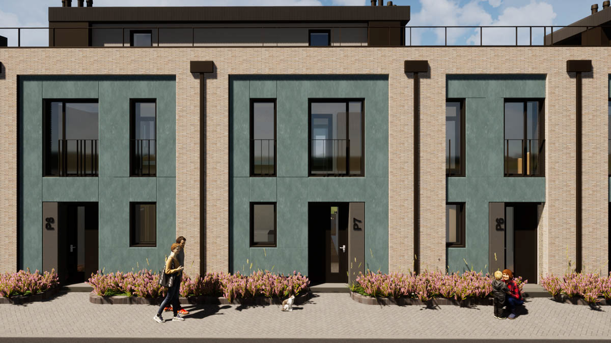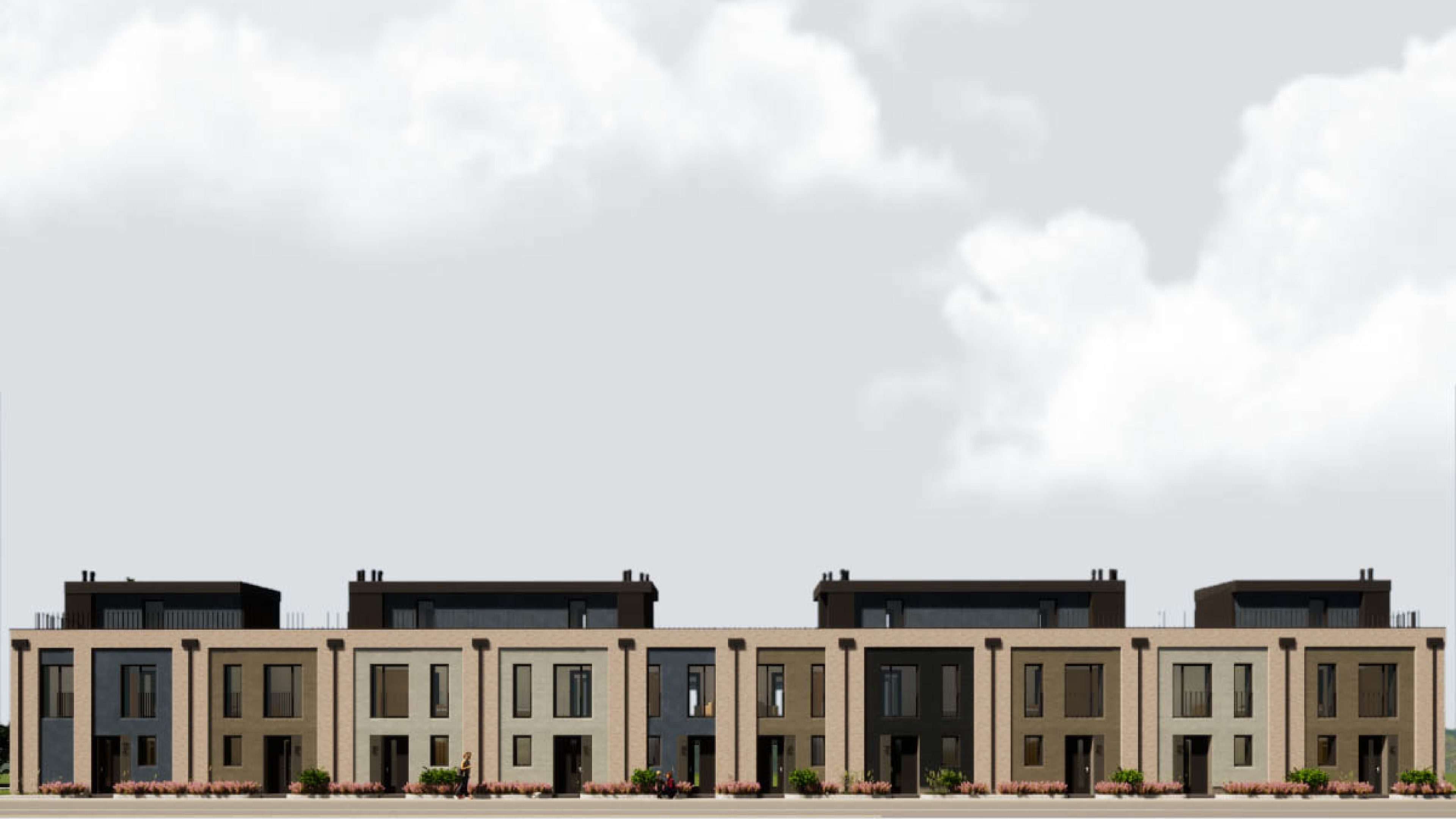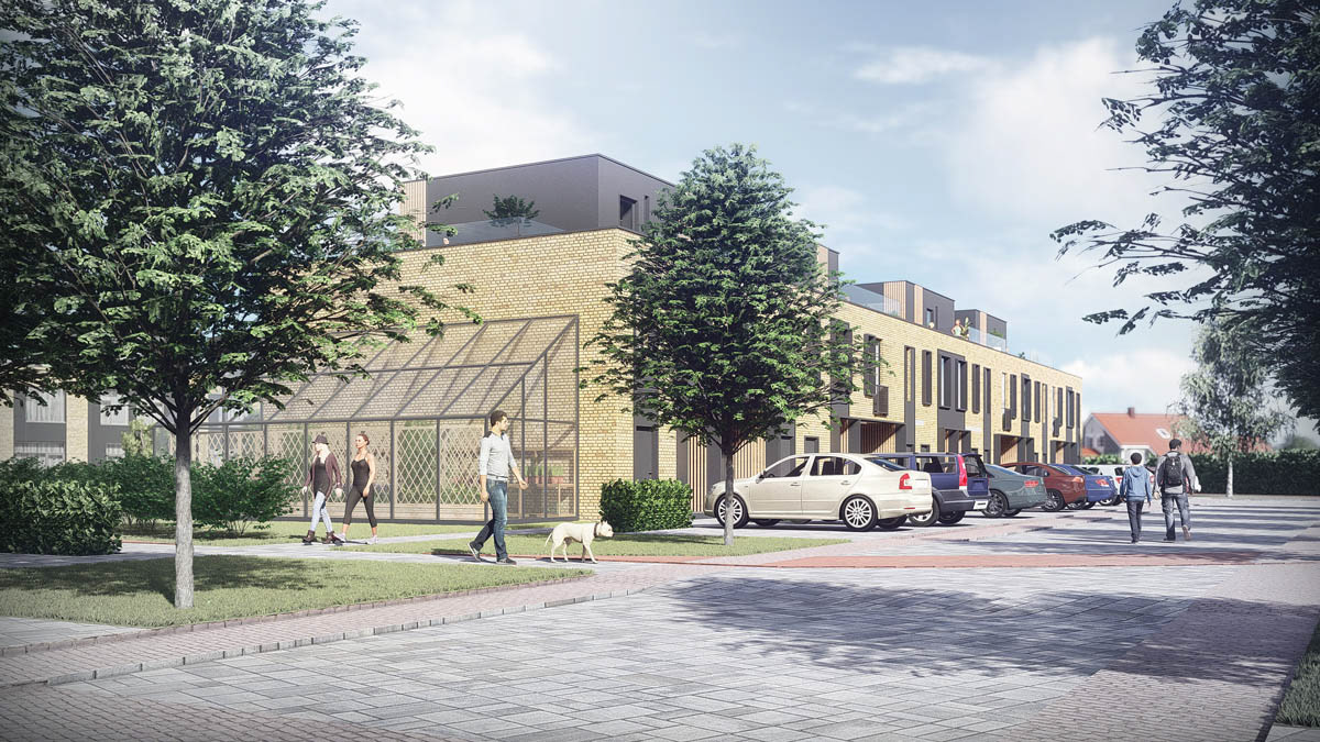 The building volumes enclose the courtyards, separating them from the roadway, while open wooden deck terraces face the courtyards, providing a visual and functional connection between the indoors and the outdoors. The landscaping includes several lush groups of plantings, partially obstructing the view between the living spaces of opposing buildings and making the outdoor area more attractive for recreation. In the initial stage of the project, the construction of shared greenhouses was also planned to meet the needs of the residents.