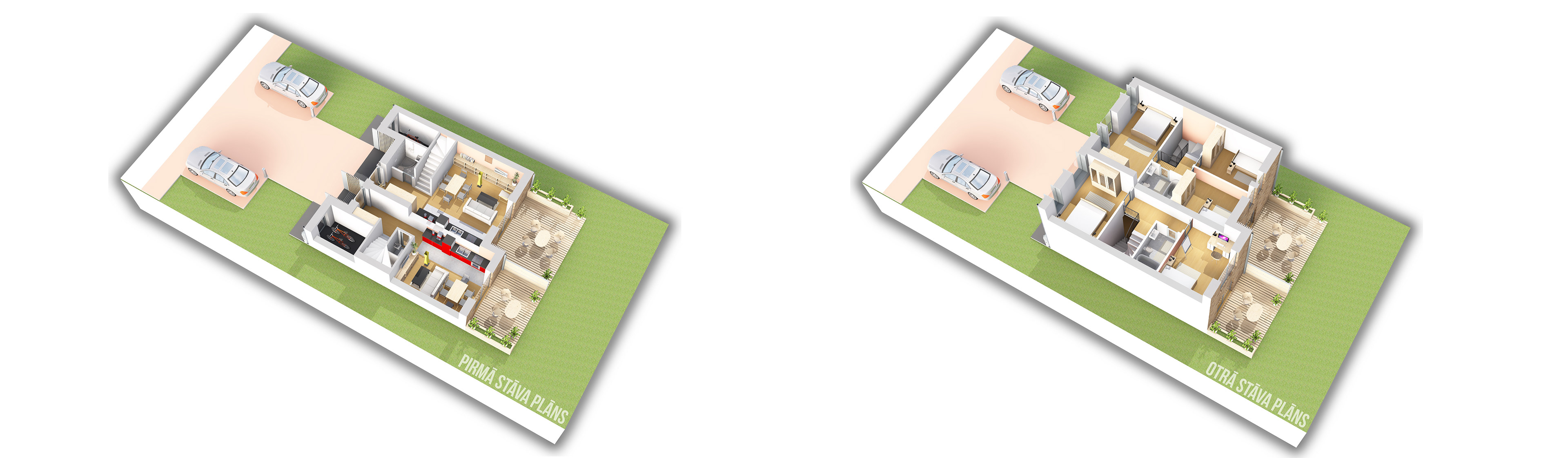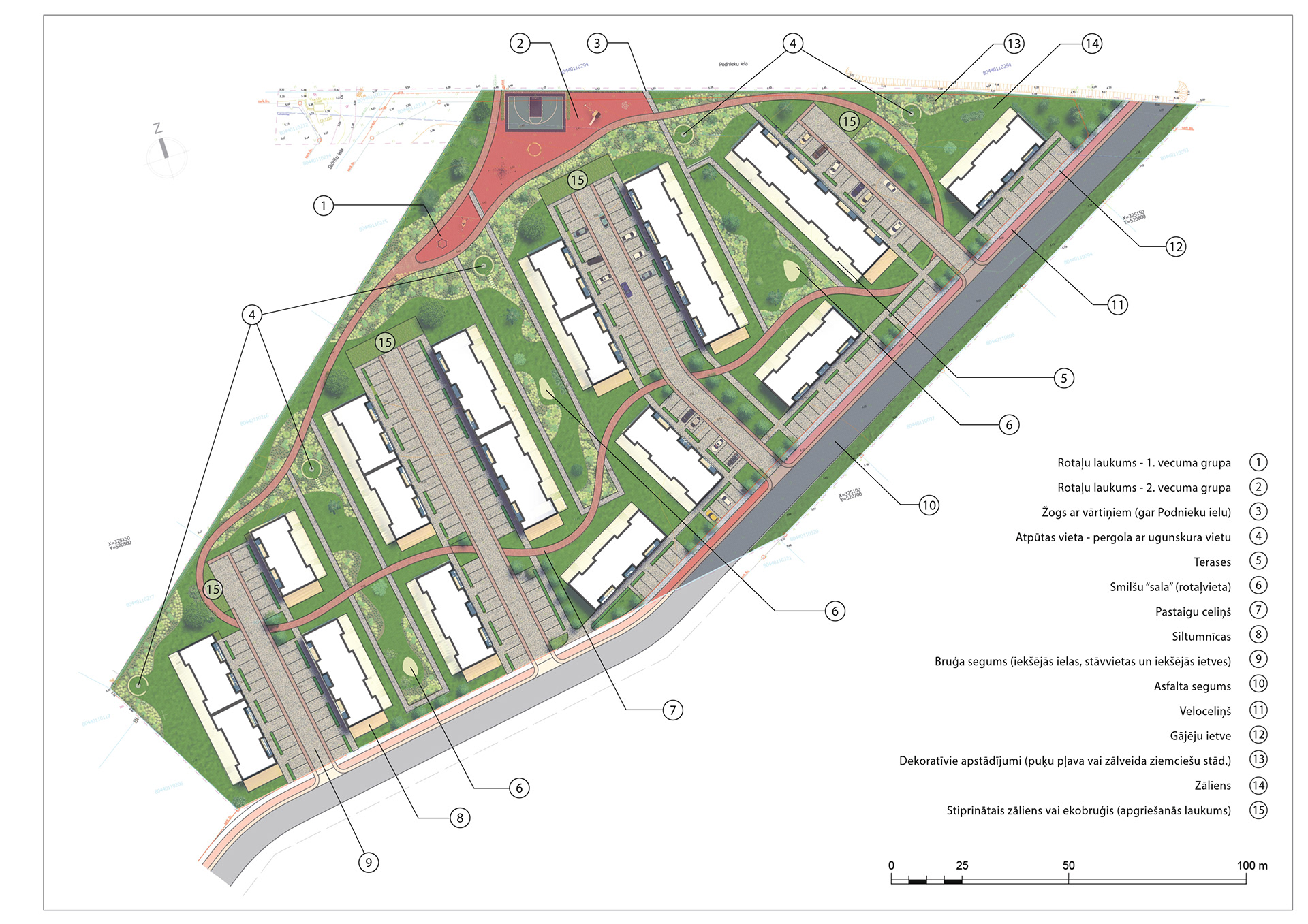 The project area consists of a 3.1-hectare plot of land located 1.4 km from the center of Ādaži. The project was initiated in 2018, and throughout its development, several building concepts were created with changes in both the territorial layout and architectural solutions. However, all versions share a common goal: to create a densely populated area with a high proportion of greenery, providing residents with a sense of a spacious and private outdoor space while not restricting public outdoor areas with fences. The layout of streets and buildings has been adapted to this goal.