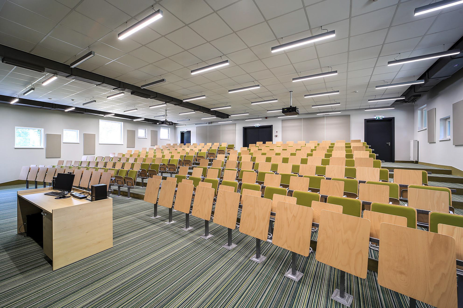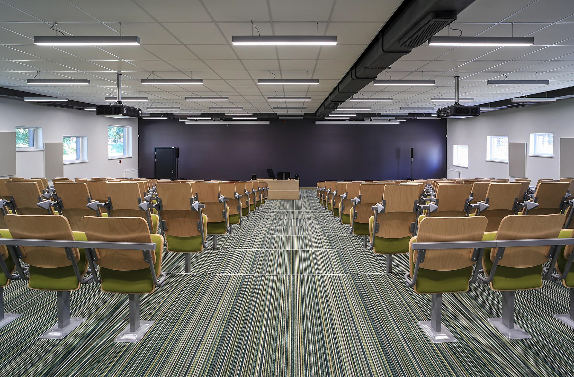 The annex contains ten laboratories/auditoriums for chemistry, physics, biology, natural sciences, robotics, and computer science, as well as several ancillary rooms and teacher spaces. The basement also includes an auditorium with seating for 160 visitors. The project was developed in a BIM environment, and the architectural solutions were prepared in collaboration with LLC Arhitektu birojs ARTEKS.
