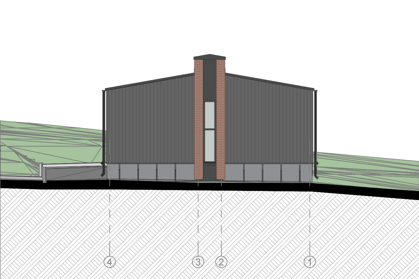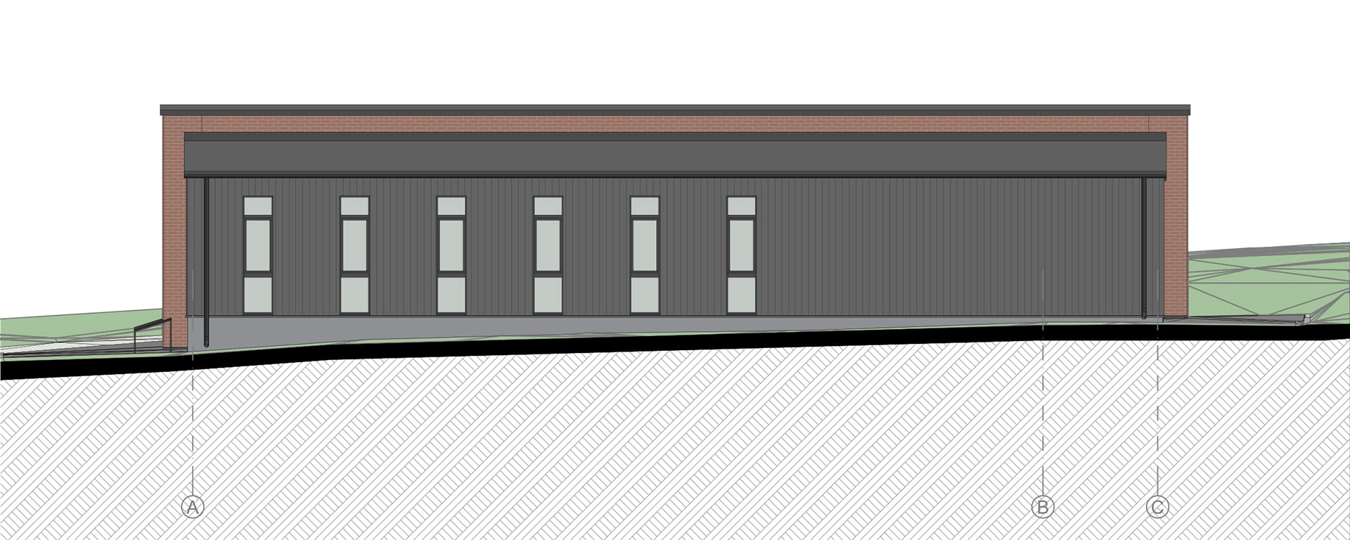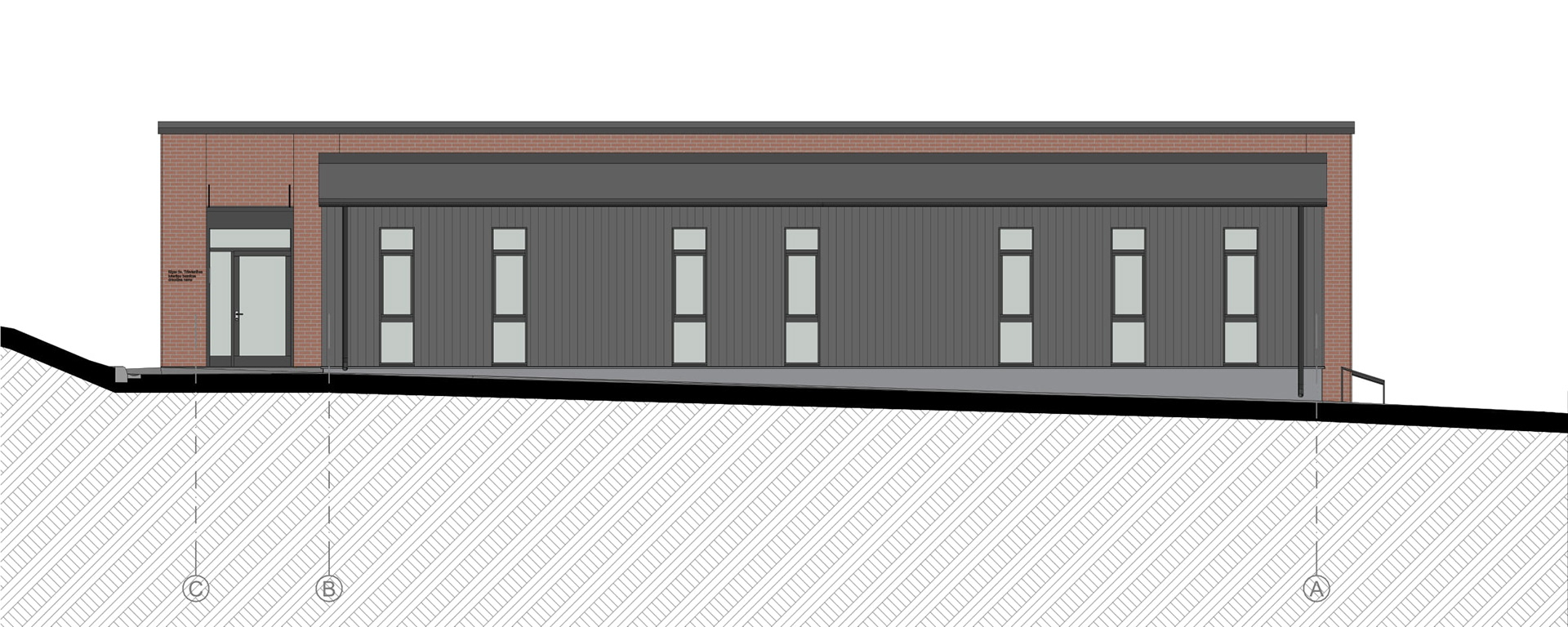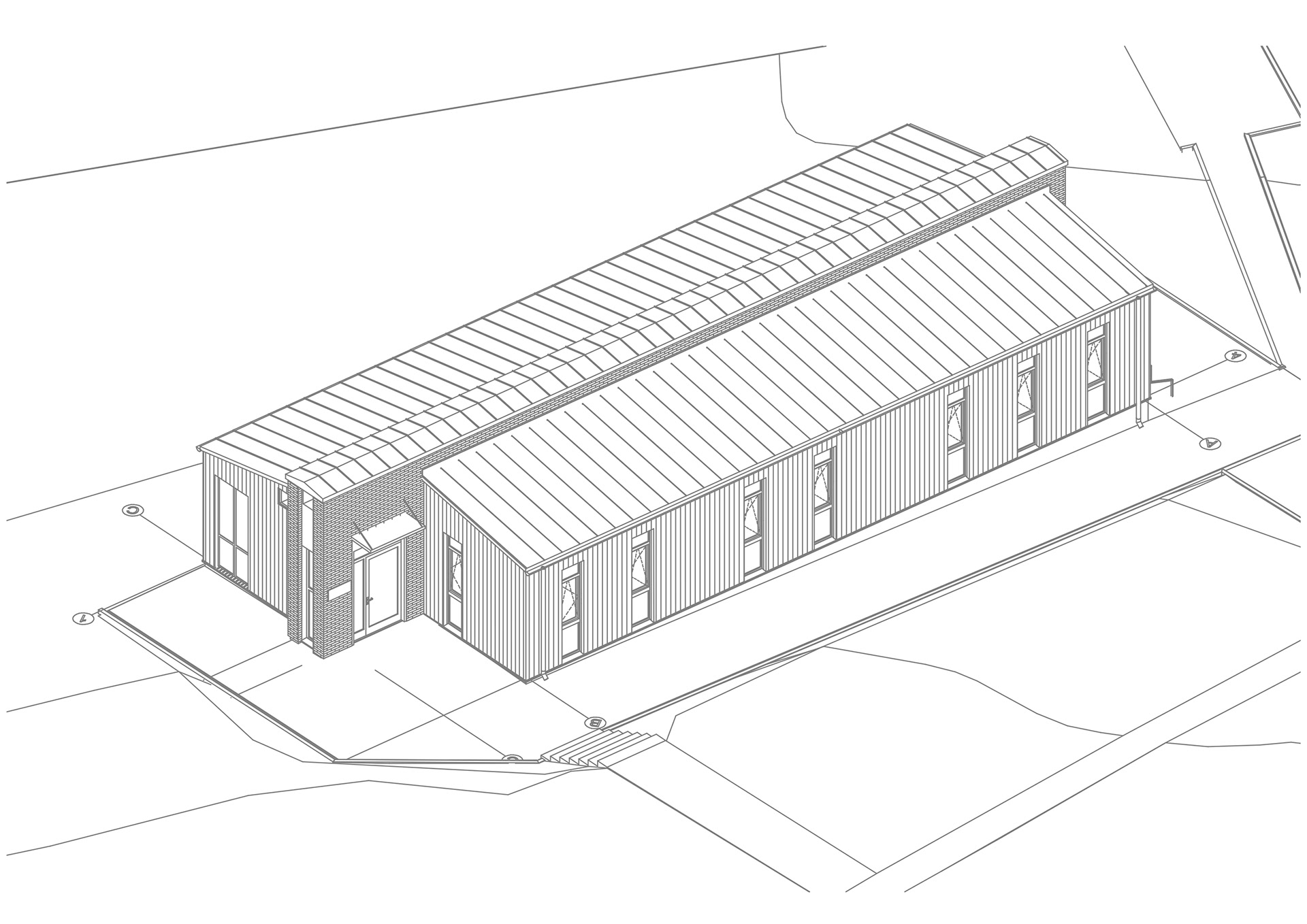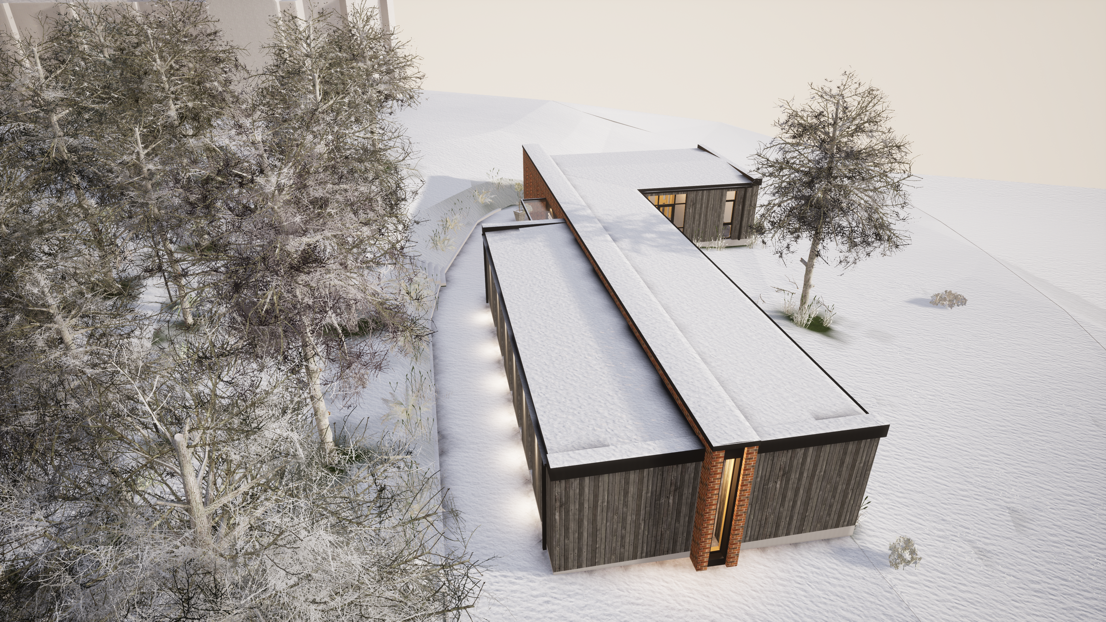 The facade is finished with wooden planks and clinker tiles that imitate the texture of brick masonry, visually aligning with the church's architecture. Large vertical windows give the building a modern character and provide natural lighting. A small gathering space is planned before the entrance, recessed into the terrain to create a unified structure with the surrounding environment.